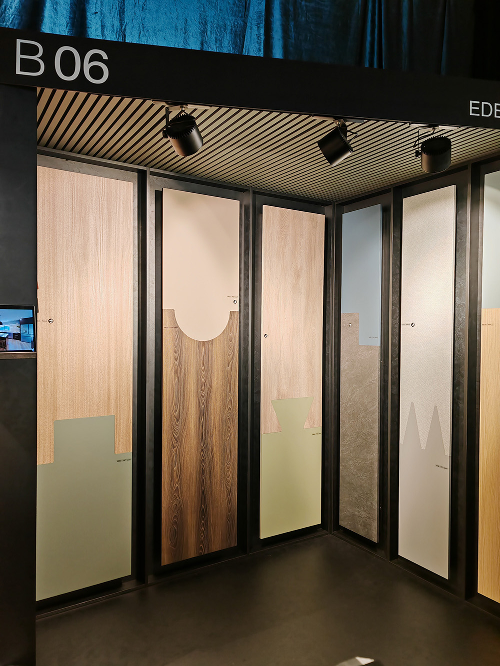 Το περίπτερο ολοκληρώνεται με την παρουσίαση των νέων Laminate Synchro , με υφές που αναπαράγουν μοναδικά το φυσικό ξύλο και των νέων ακουστικών πάνελ με PET matt επιφάνειες, που συνδυάζουν αισθητική, λειτουργικότητα και περιβαλλοντική υπευθυνότητα.